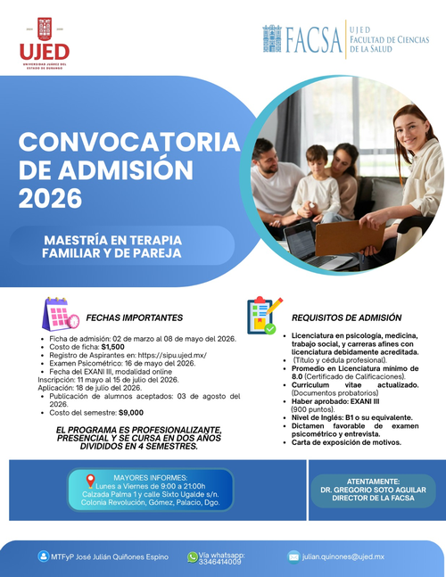 El Maestro en Terapia Familiar y de Pareja mantiene una actitud de servicio, respeto a la diversidad y disposición al trabajo multidisciplinario.