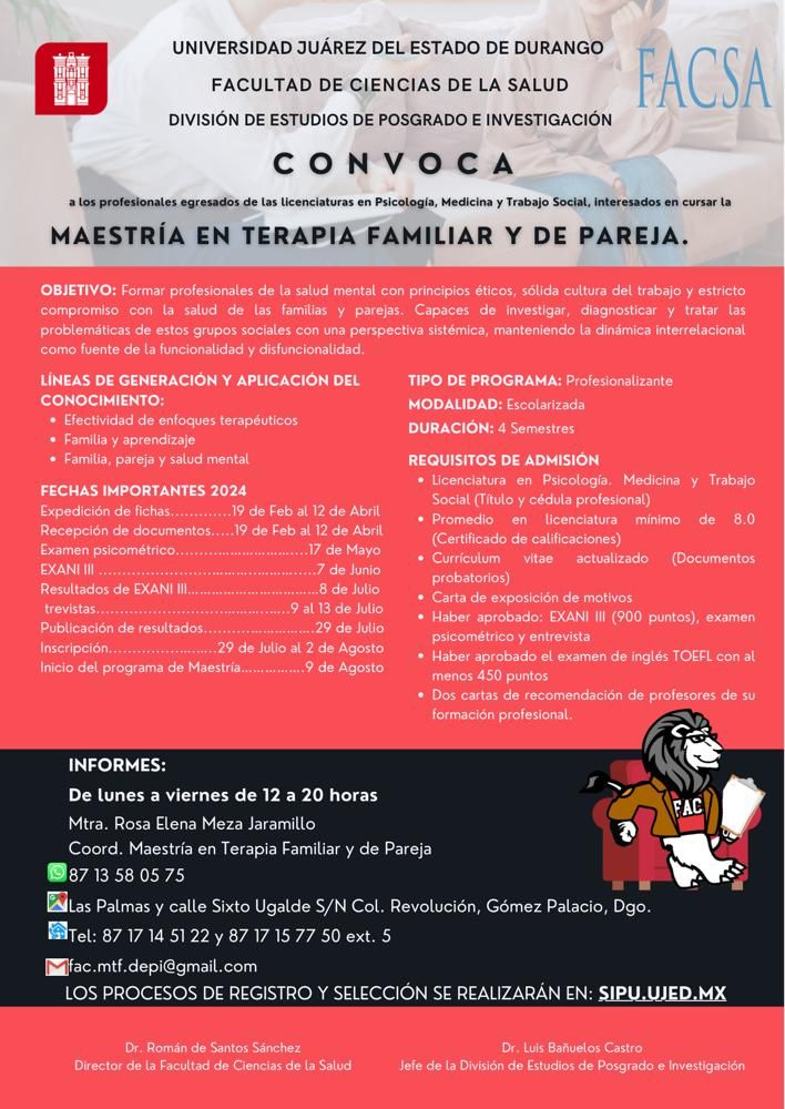 El maestro en Terapia implementa técnicas de entrevista, registro de información y diagnóstico familiar y de pareja; de igual manera aplica los modelos terapéuticos, para la resolución de aquellas problemáticas que tienen su origen en la interacción del sistema familiar y el subsistema de pareja.